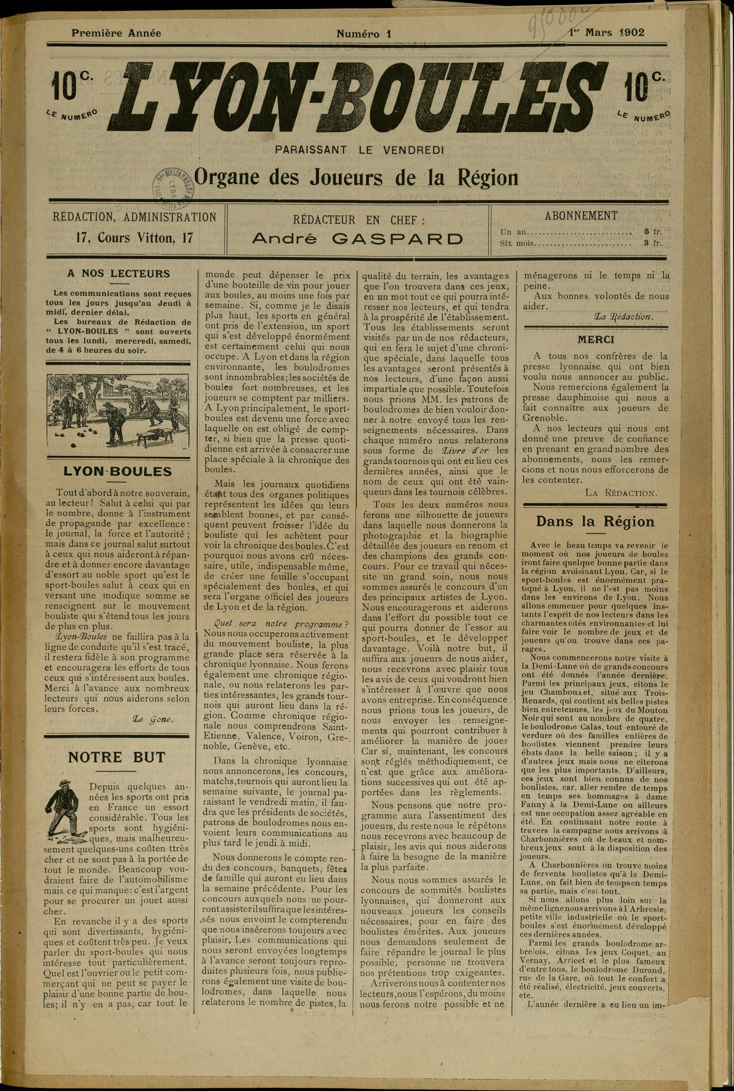— (La rédaction, Notre but, Lyon-boules no 1, 1er mars 1902, page 1)Les vedettes du sport-boules ont envoyé leur adhésion et l’on suppose généralement que les Lyonnais auront fort à faire pour remporter la palme. Ils vont trouver, en effet, cette fois-ci, des équipe de l’Isère et de la Drôme notamment capables de leur résister.